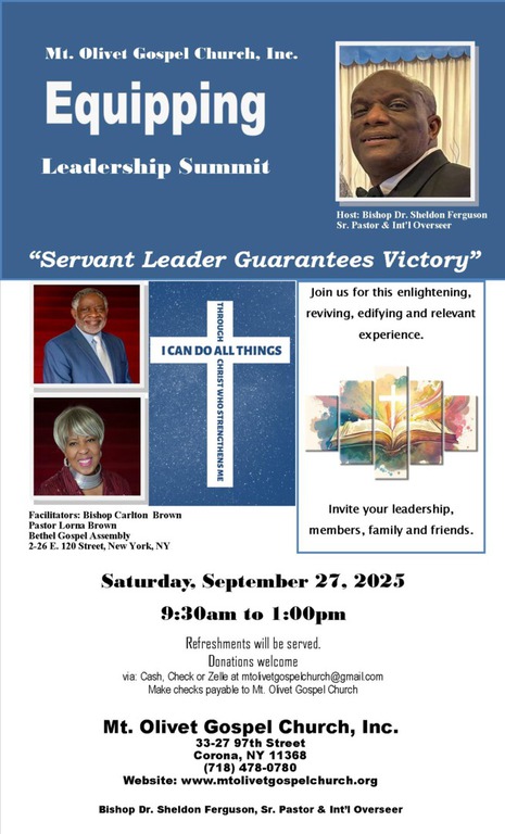 Find what's missing in your life by visiting our church in Corona, New York. You can fill the void in your life by developing a personal relationship with Jesus Christ at Mt. Olivet. Our ministry is comprised of services throughout the community such as a food pantry and ministering to drug rehabilitation centers to name a few. We are a Pentecostal missions-minded church and have established the Mt. Olivet Bible Church in Liberia. Also with God's help, we were able to build the Bishop James Wellington Junior and High School with an enrollment of 600 students. The Lord has added several other churches that have joined the ministry in Liberia. We are endeavoring to carry out the commandment of Jesus Christ, reaching our community and individuals in other lands. They too can experience great joy in the Lord. We pray you will always remember "For God so loved the world that He gave His only Son and whoever believes in Him shall not perish but have ever lasting life" John 3:16.